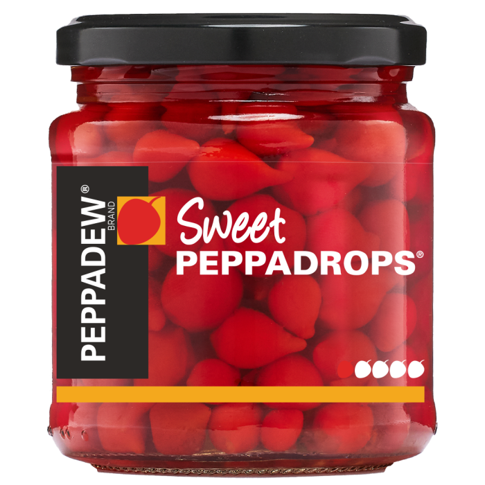Sweet Peppadew peppers are small, bite-sized, red piquanté peppers from South Africa that are pickled in a sweet and tangy brine, creating a unique sweet-and-sour flavor with a mild heat. They have a firm, crunchy texture and are often used in salads, on antipasti platters, or stuffed with fillings like cream cheese or goat cheese.