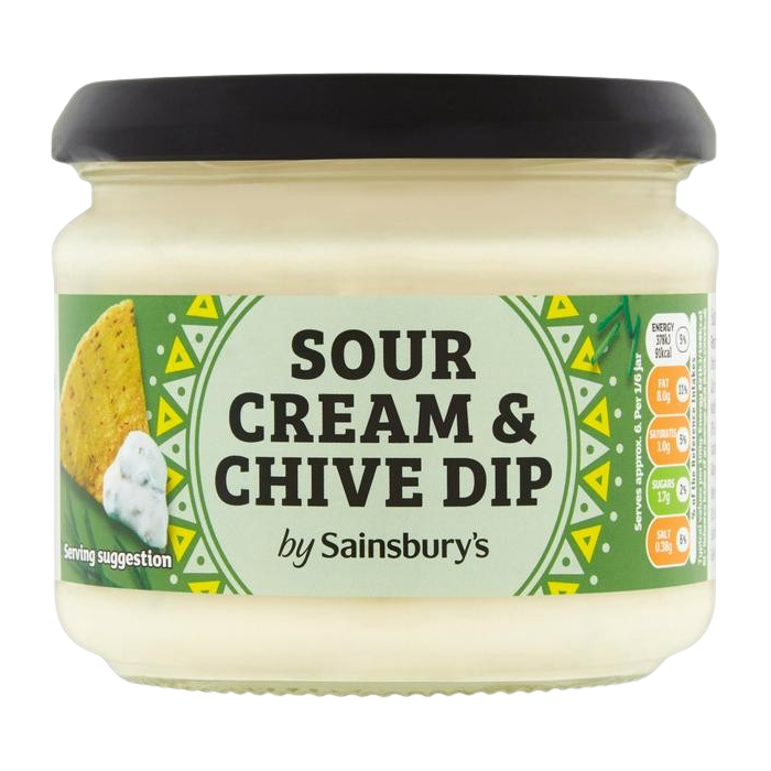 A soured cream and chive dip is a dip made from fermented sour cream, finely chopped chives, and other ingredients like mayonnaise, garlic, and lemon juice. It's a popular appetizer served with snacks like potato chips and vegetable sticks, or used as a topping for baked potatoes.