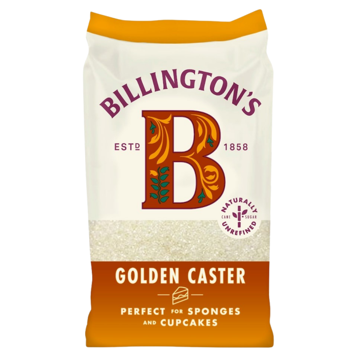 Golden caster sugar is a fine-grained, unrefined sugar with a warm, golden color and a delicate honeyed flavor due to the natural molasses content. It is ideal for baking light sponges, meringues, and shortbread, and is similar to regular caster sugar but with a richer taste.