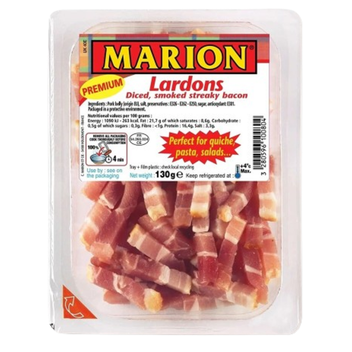 A bacon lardon is a small cube or strip of fatty bacon used to add flavor and richness to savory dishes, originating from French cuisine. Lardons are typically made from pork belly and are cut from a thick slab of bacon, though they can be made from any thick-cut, fatty bacon.